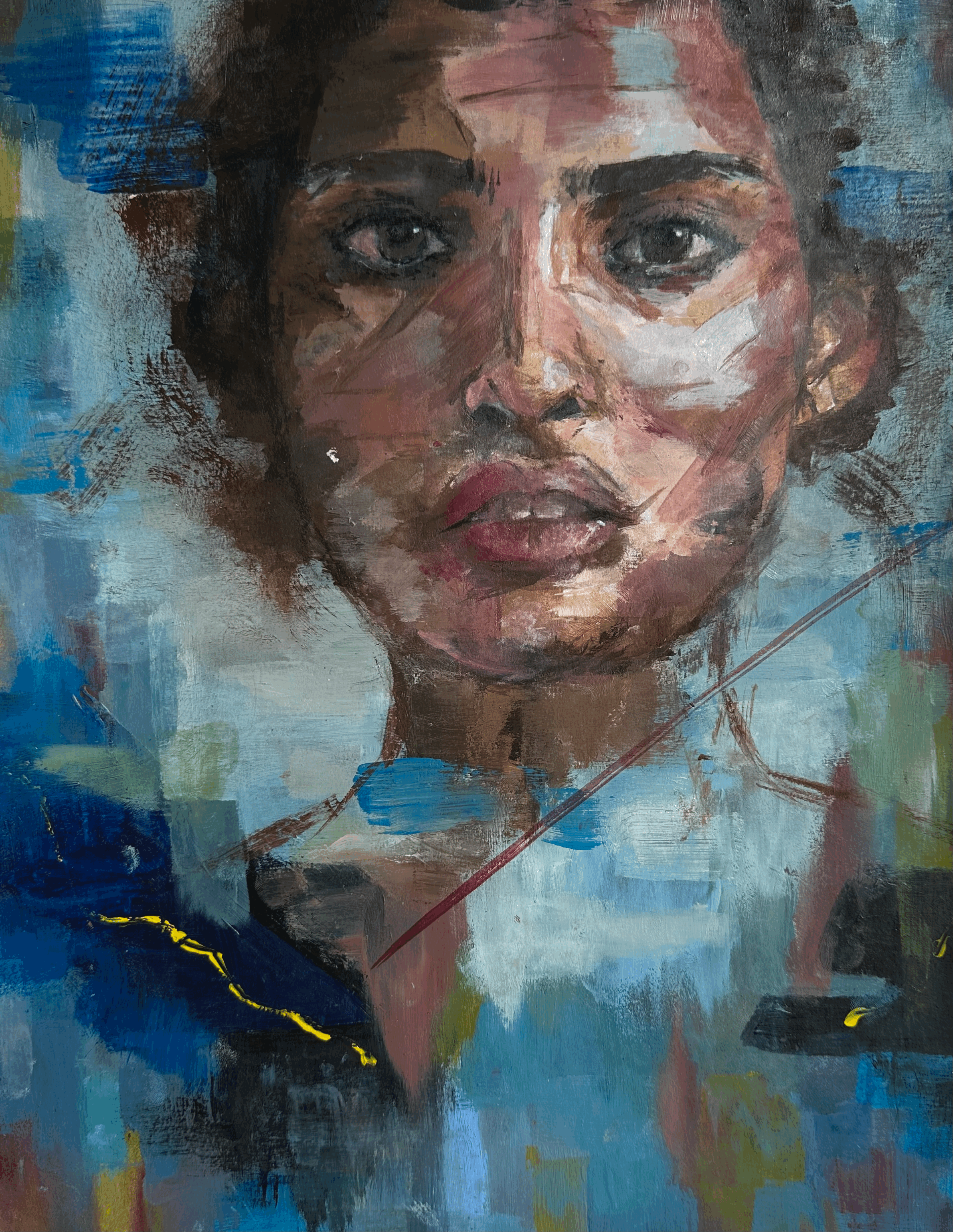 Inspired by Ryan Hewett, and his semi-abstract approach to constructing the human face, with purposeful placement of colour and brushstroke was highly influential to me when developing this portrait.